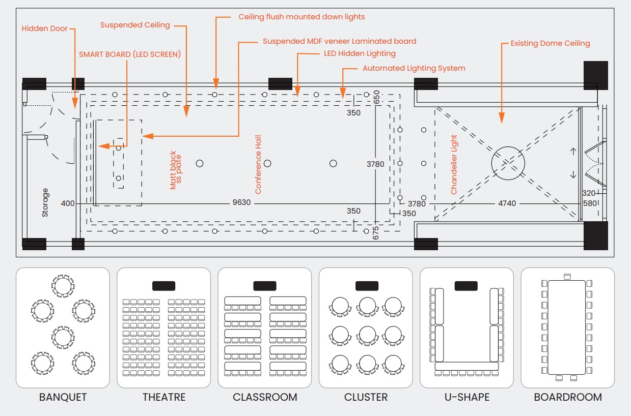 | Boardroom Style | Single table with chairs around | 50 | Meetings, small discussions |